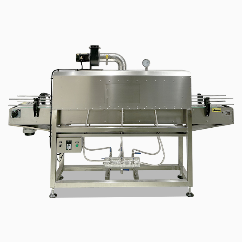 • 帶有封閉薄膜的產品被輸送帶送入蒸汽收縮通道。