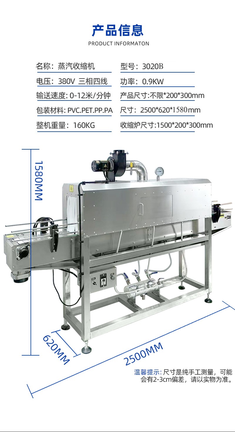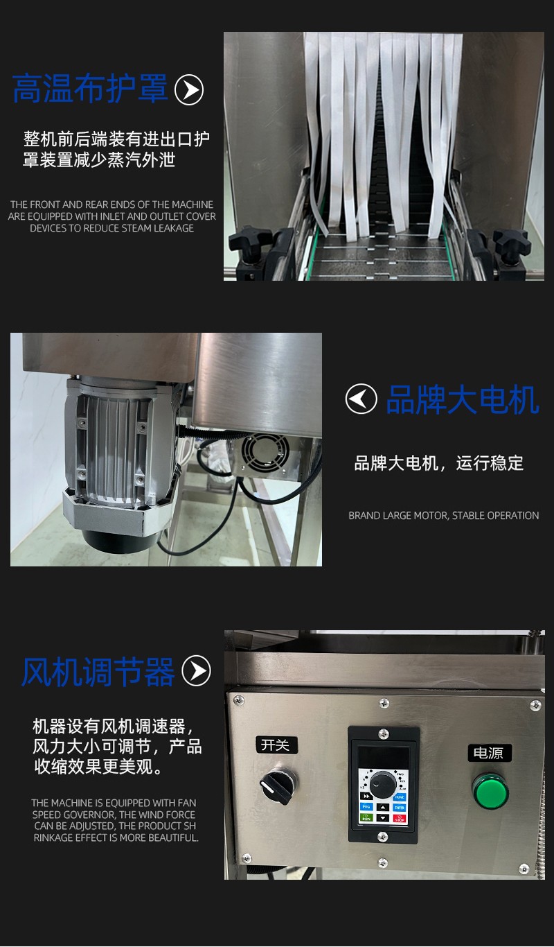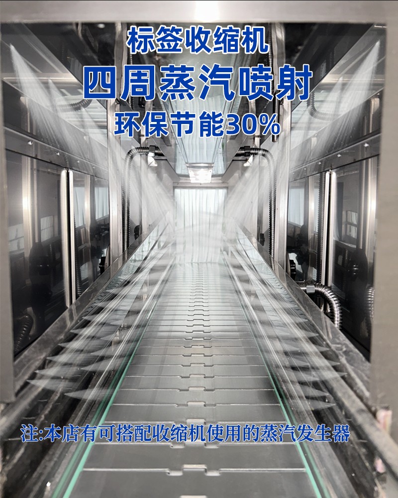 • 加熱效果優越:利用蒸汽恒溫且溫度擴散均勻的特性工作,能達到普通電熱紅外加熱收縮機不可比擬的效果。設備采用加熱器加熱水產生蒸汽,無需另外配備蒸汽鍋爐。主機有主副 2 個加熱器,可根據生產速度調節功率大小,輸送帶采用無級調速,輸送速度可任意調節。