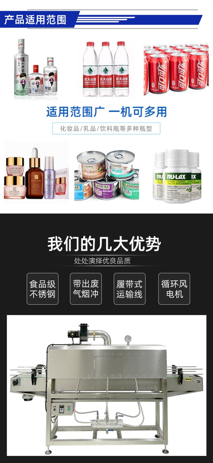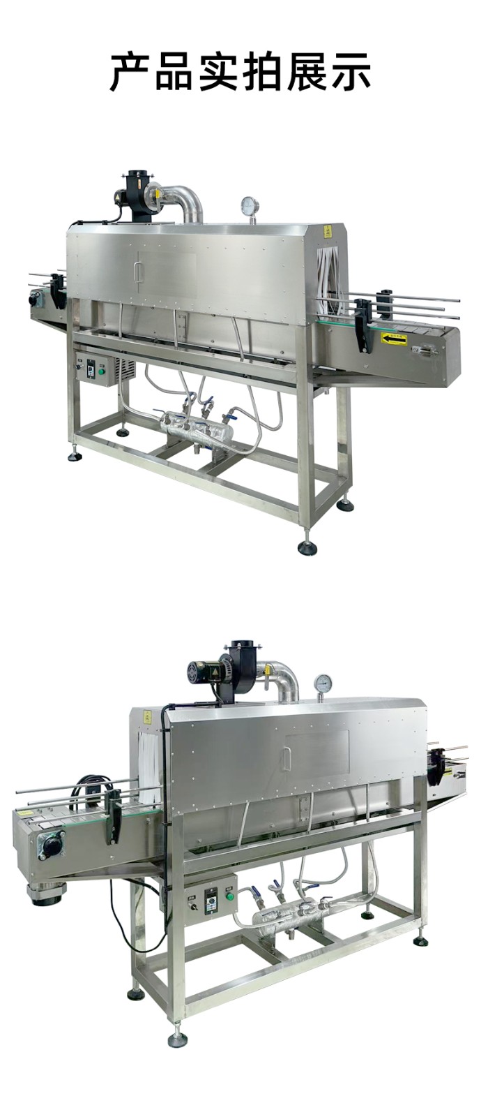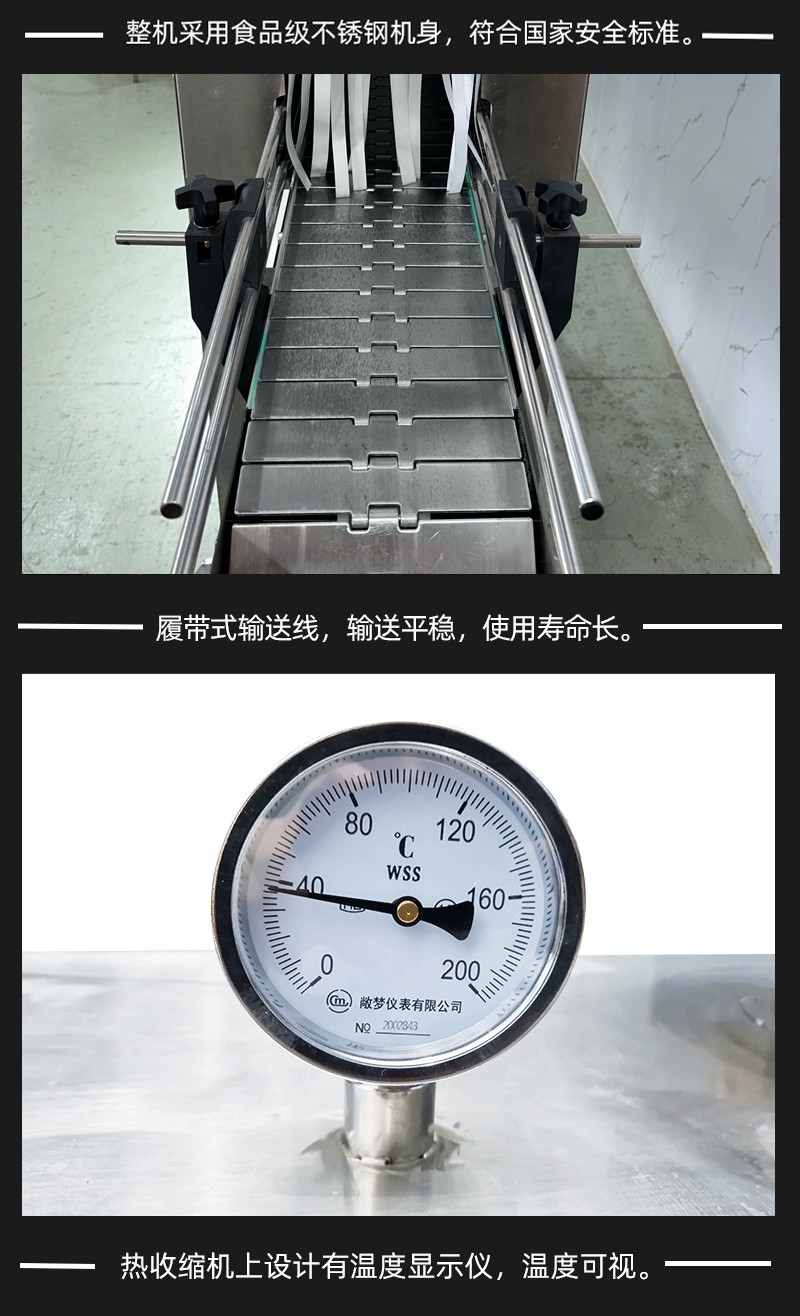 • 加熱效果優越:利用蒸汽恒溫且溫度擴散均勻的特性工作,能達到普通電熱紅外加熱收縮機不可比擬的效果。設備采用加熱器加熱水產生蒸汽,無需另外配備蒸汽鍋爐。主機有主副 2 個加熱器,可根據生產速度調節功率大小,輸送帶采用無級調速,輸送速度可任意調節。